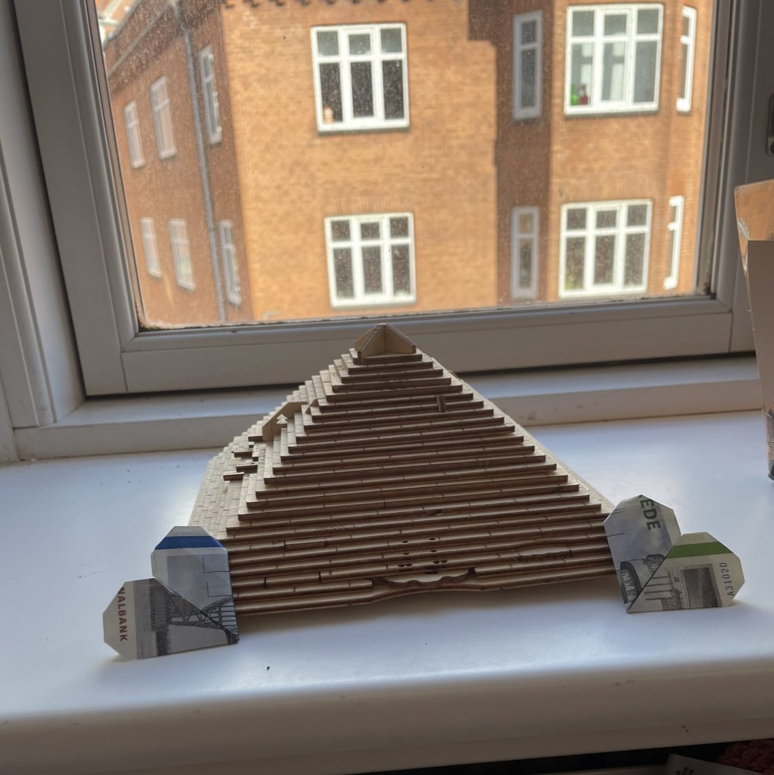 Fold pengesedlerne så det ligner, der er et større pengebeløb og fuldfør med teksten “i nødstilfælde slå glasset ind” eller noget lignende. På billedet til højre er der brugt 2×500 kr.