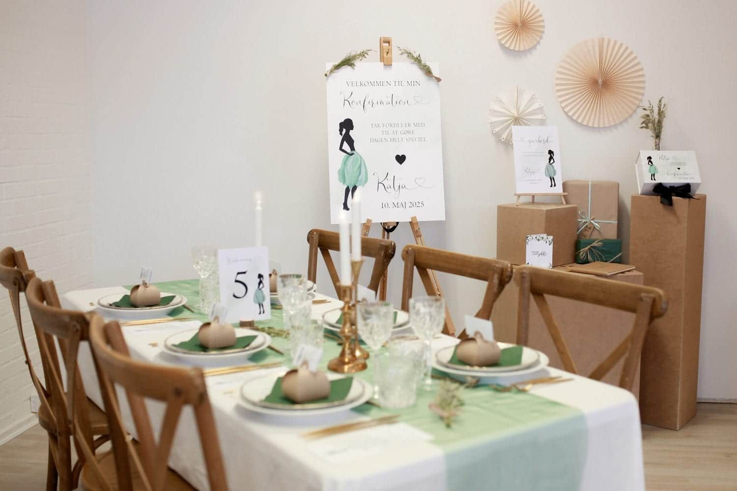 Kan du godt lide stilen på billederne? Så tjek vores konfirmationsdesign Silhuette Green ud her eller se flere billeder nedenfor. Hvis du er mere til en klassisk piget konfirmationsfest med lyserød- og guldtema, så kan du læse vores blogindlæg Lyserød Konfirmationsfest her.