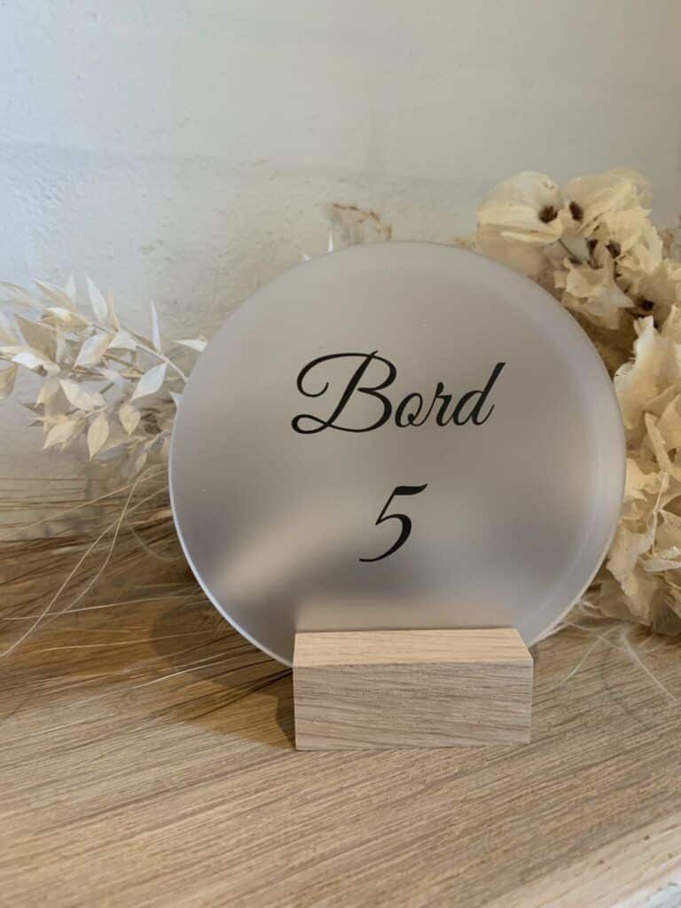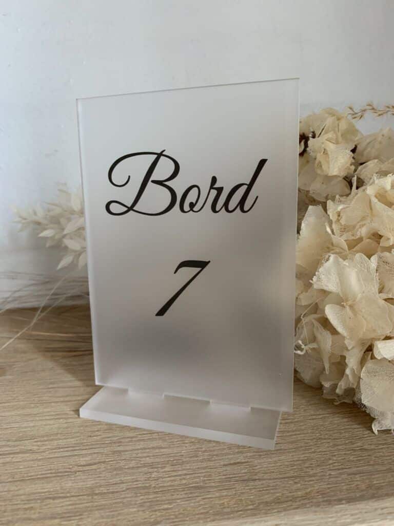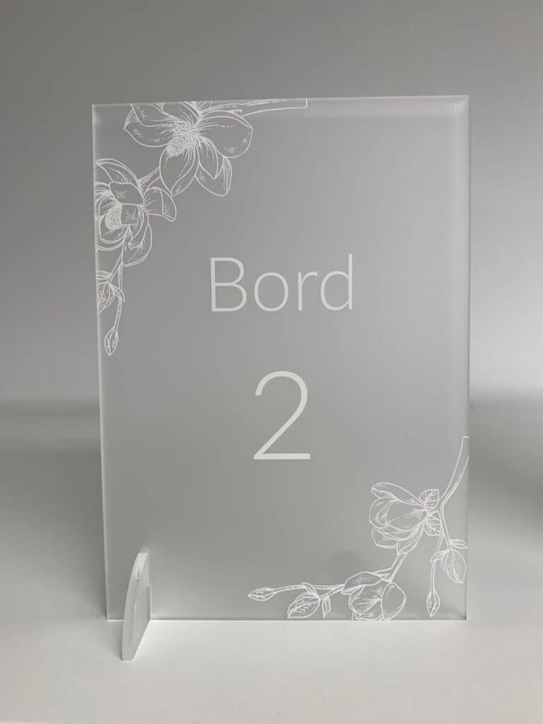 - Frosted akryl: Frosted akryl giver en blødere og mere subtil effekt, som kan være ideel til mere romantiske eller intime begivenheder. Vi anbefaler at bruge farvet skrift for at sikre, at teksten skiller sig tydeligt ud.