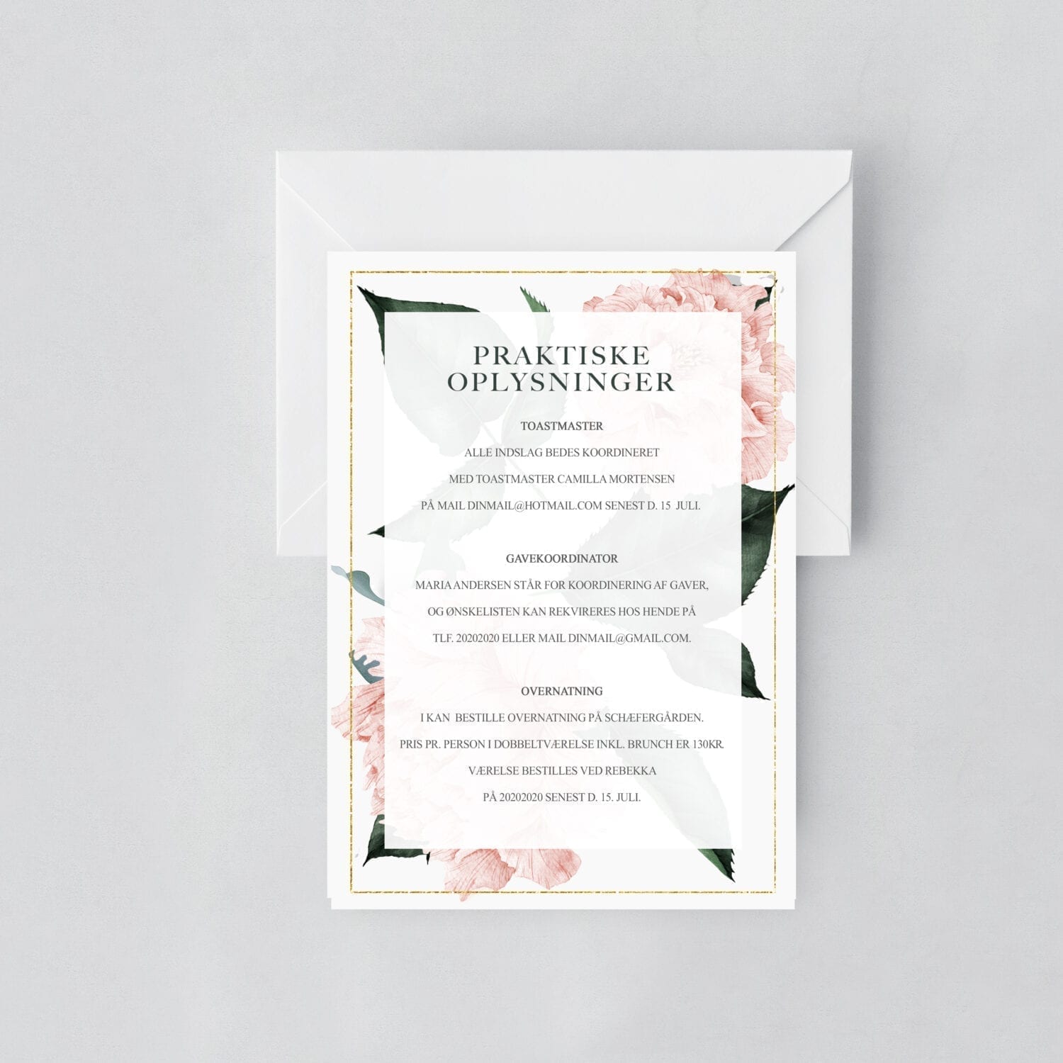 A5 (14,8x21cm): ideelt til jer, der ønsker at inkludere flere detaljer om dagen, såsom tidsplan, kørselsvejledning og overnatningsmuligheder. A5-formatet giver rigeligt plads til både tekst og smukke design elementer.