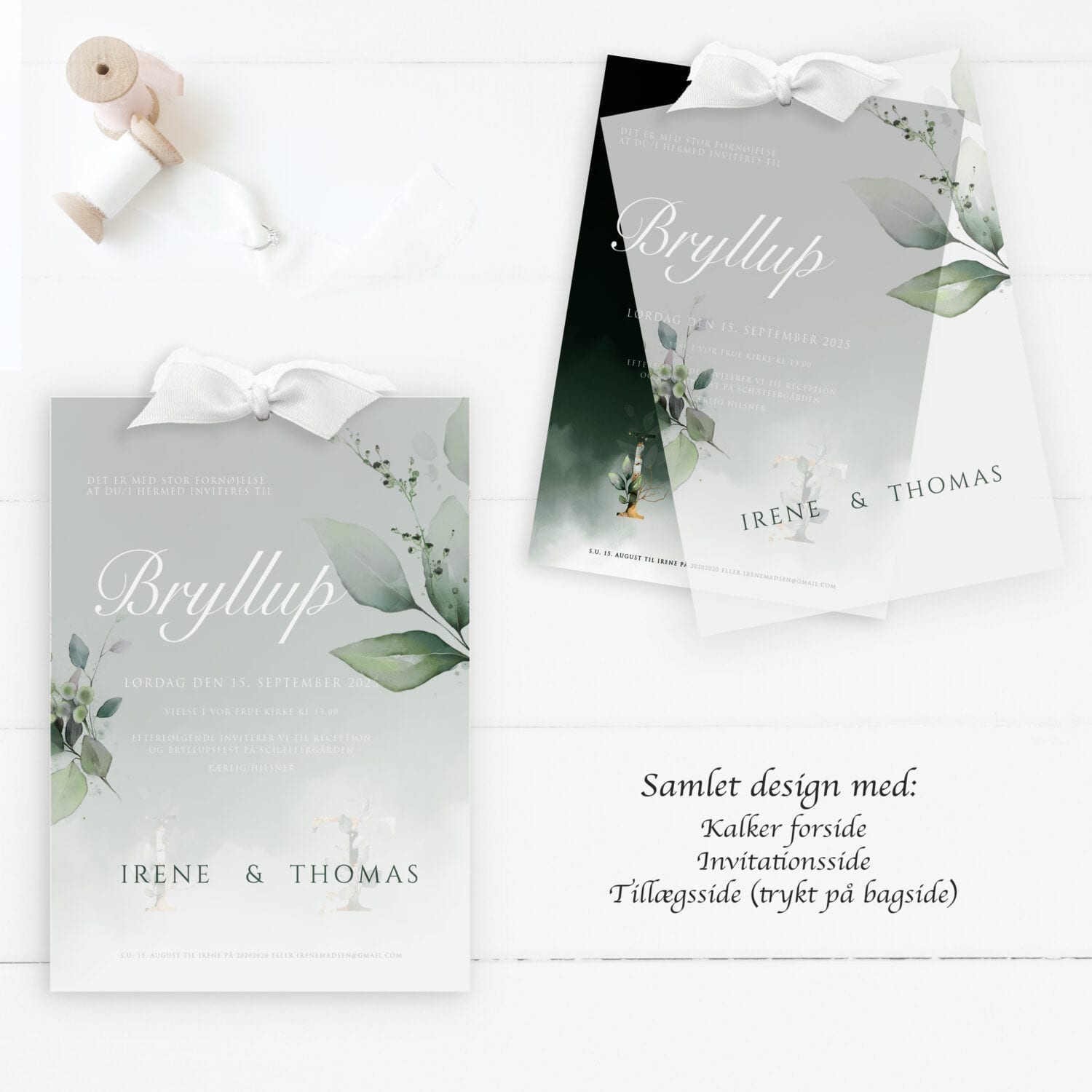 Bag Kalkerpapiret fremkommer invitationen. Den er trykt på høj kvalitets karton, som giver en solid og luksuriøs følelse. Den dybe mørkegrønne farve tilføjer en klassisk elegance, der passer perfekt til et stilfuldt bryllup.Praktisk og elegant