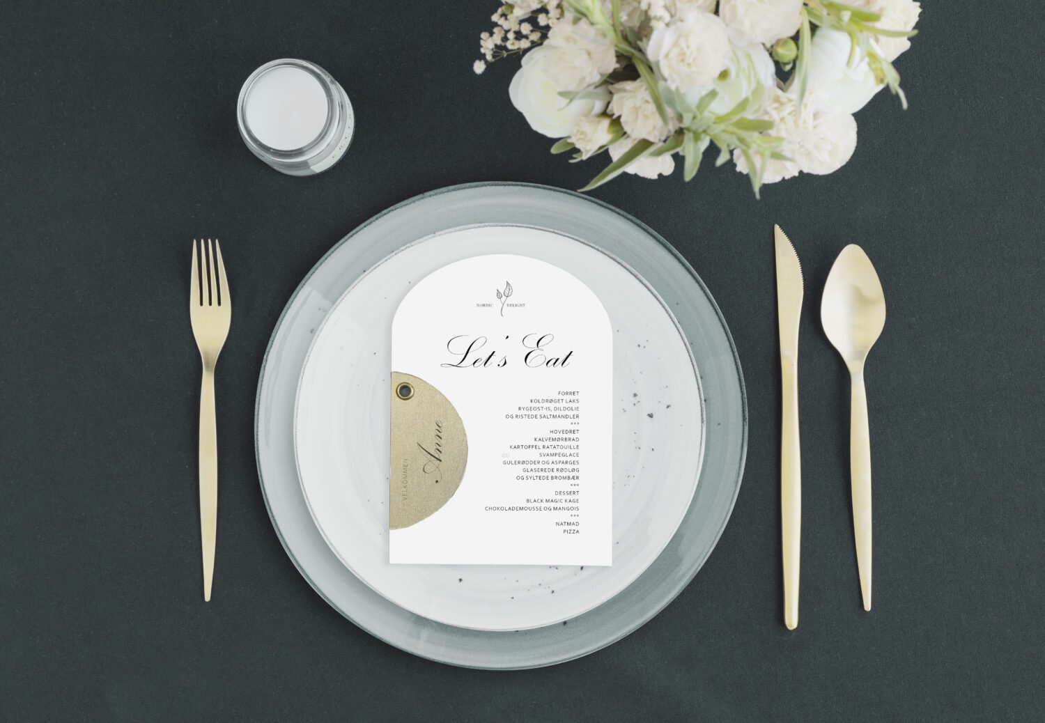 Vores Daylight haze er et perfekt sæt med menukort i halv arch format og måneformet bordkort der smukt hænger ved i en nitte.