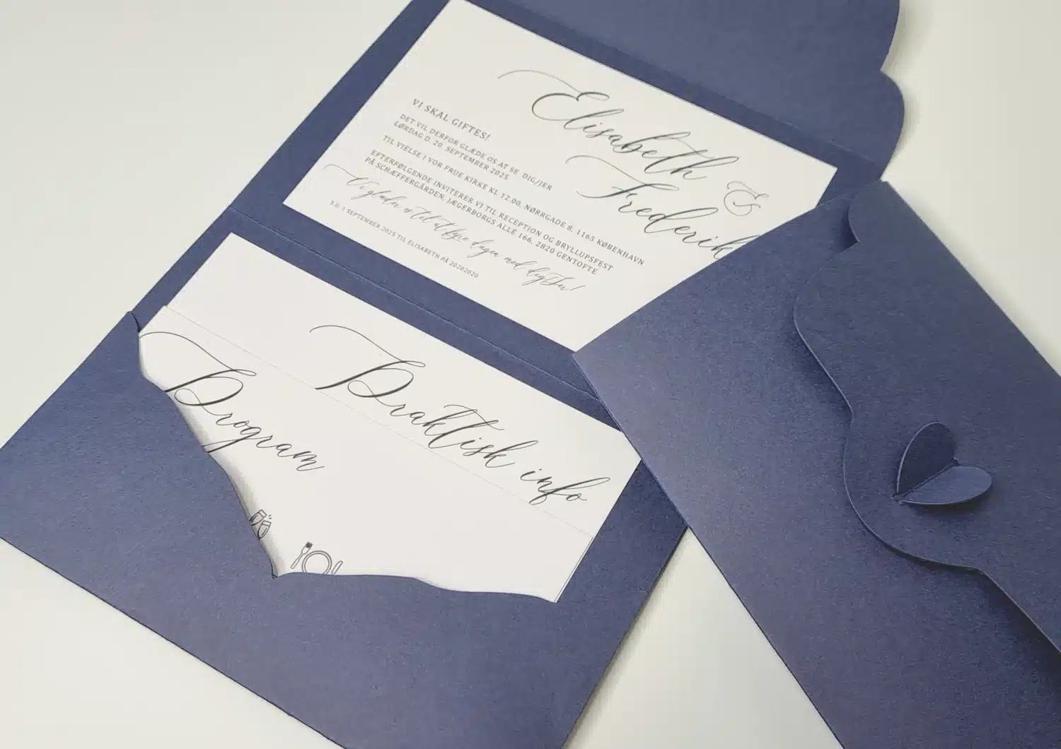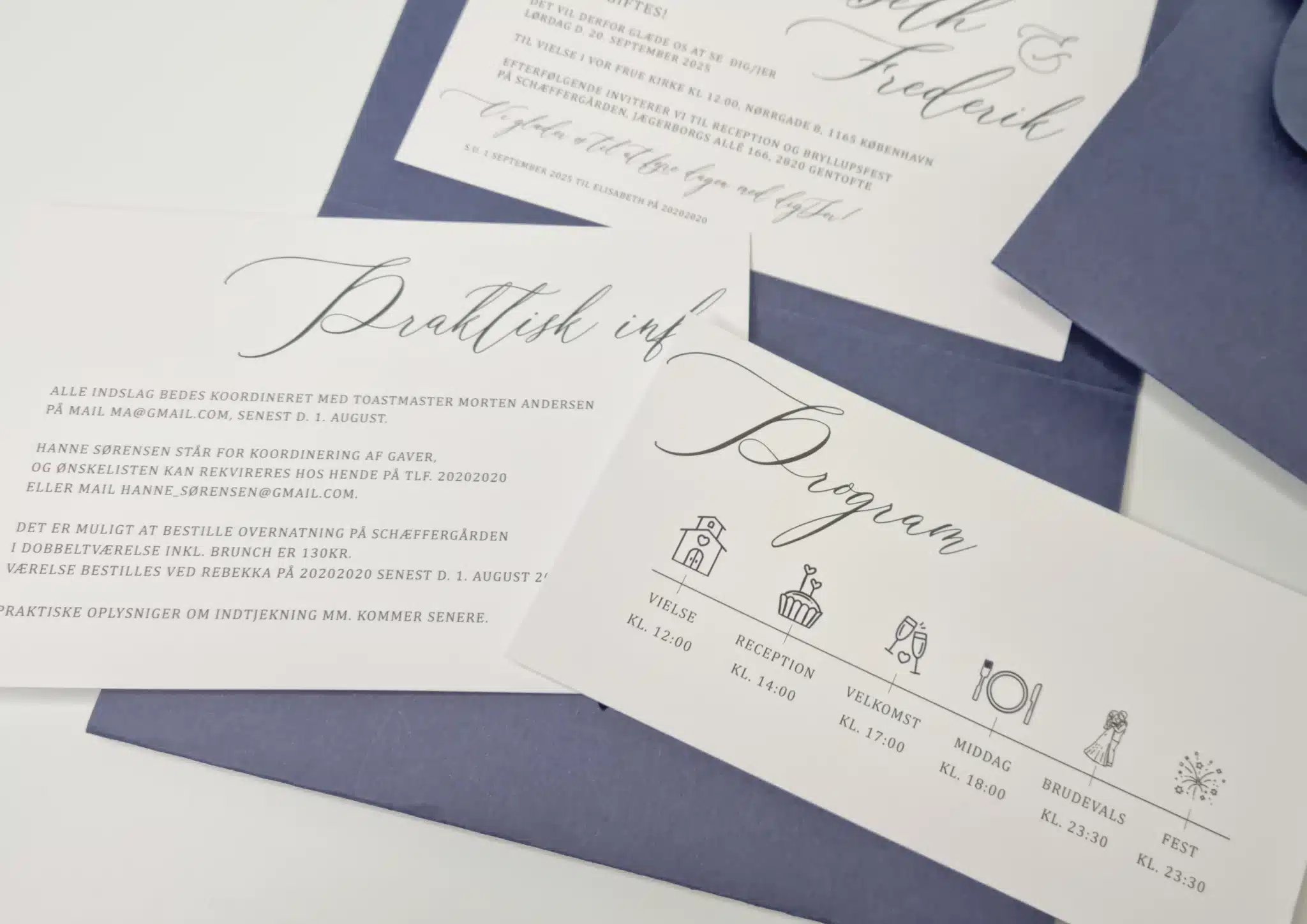 Vores mission er at gøre jeres dag både smuk og personlig, og vi kan tilpasse alle elementer efter jeres ønsker – lige fra papirvalg til små detaljer i layoutet. Kontakt os gerne, hvis I har specifikke ideer eller ønsker, så hjælper vi med at gøre dem til virkelighed!