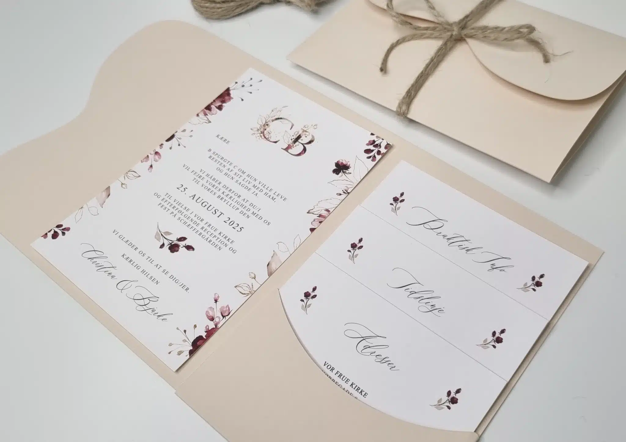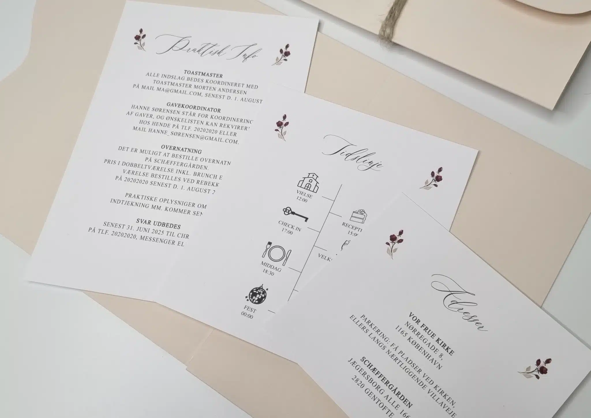 Vores mission er at gøre jeres dag både smuk og personlig, og vi kan tilpasse alle elementer efter jeres ønsker – lige fra papirvalg til små detaljer i layoutet. Kontakt os gerne, hvis I har specifikke ideer eller ønsker, så hjælper vi med at gøre dem til virkelighed!