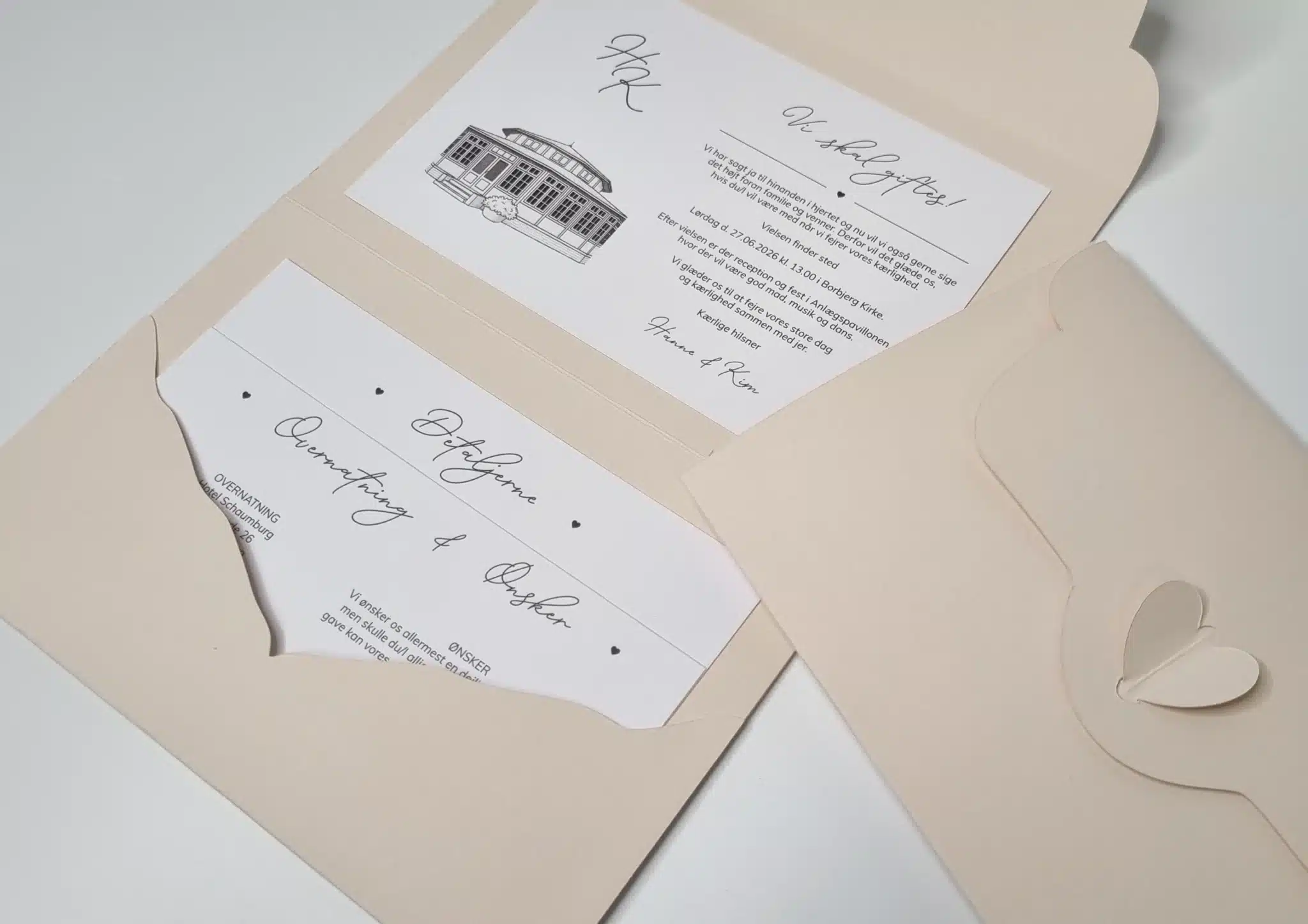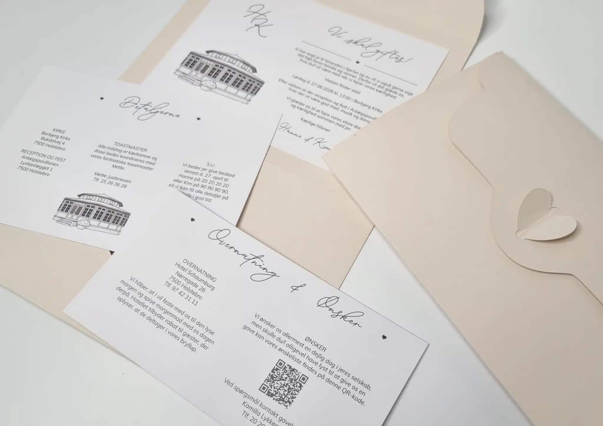 Vores mission er at gøre jeres dag både smuk og personlig, og vi kan tilpasse alle elementer efter jeres ønsker – lige fra papirvalg til små detaljer i layoutet. Kontakt os gerne, hvis I har specifikke ideer eller ønsker, så hjælper vi med at gøre dem til virkelighed!