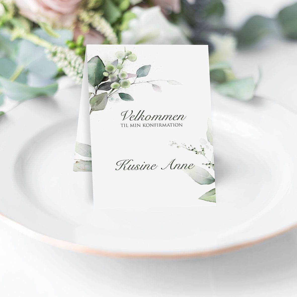 Flot kort i A6 format. Kortet består af 4 sider med valgfri tekst: Forside med festens dato og konfirmandens navn – eventuelt med gæsternes navne trykt på, så det fungerer som bordkort Indersider med velkommen og velbekomme sang Bagsiden som menukort I sparer derfor på tryksager med én flot samlet løsning i jeres ønskede design! Indsæt din ønskede tekst til kortet– så klarer vi resten!