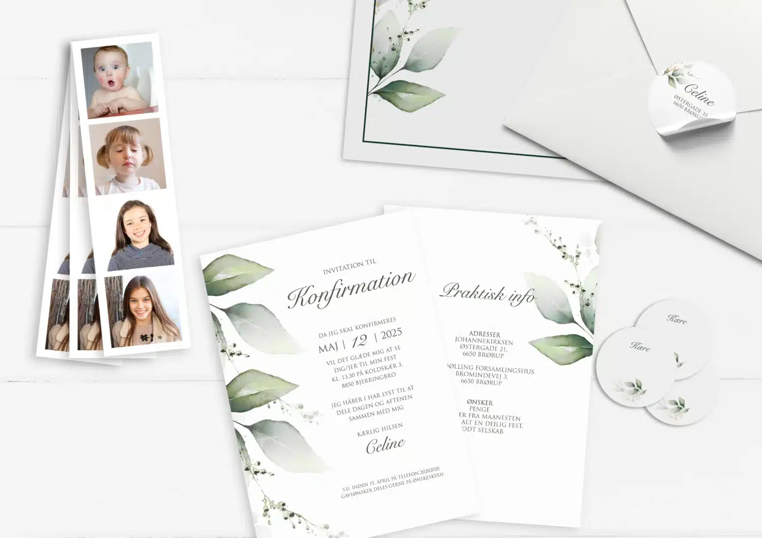 Hvad følger der med i prisen? Prisen gælder for én invitation i den størrelse, du vælger. Du kan selv vælge størrelsen, og prisen justeres alt efter dit valg. Bemærk, at produkter som kuverter, fotostriber og lignende ikke er inkluderet i prisen – de kan tilføjes som tilkøb nederst på siden.