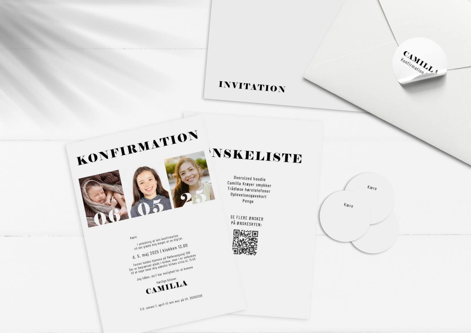 Hvad følger der med i prisen? Prisen gælder for én invitation i den størrelse, du vælger. Du kan selv vælge størrelsen, og prisen justeres alt efter dit valg. Bemærk, at produkter som kuverter, fotostriber og lignende ikke er inkluderet i prisen – de kan tilføjes som tilkøb nederst på siden.