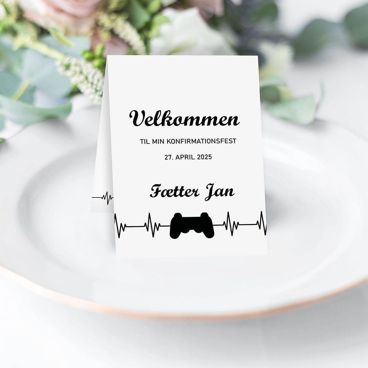 Flot kort i A6 format. Kortet består af 4 sider med valgfri tekst: Forside med festens dato og konfirmandens navn – eventuelt med gæsternes navne trykt på, så det fungerer som bordkort Indersider med velkommen og velbekomme sang Bagsiden som menukort I sparer derfor på tryksager med én flot samlet løsning i jeres ønskede design! Indsæt din ønskede tekst til kortet– så klarer vi resten!