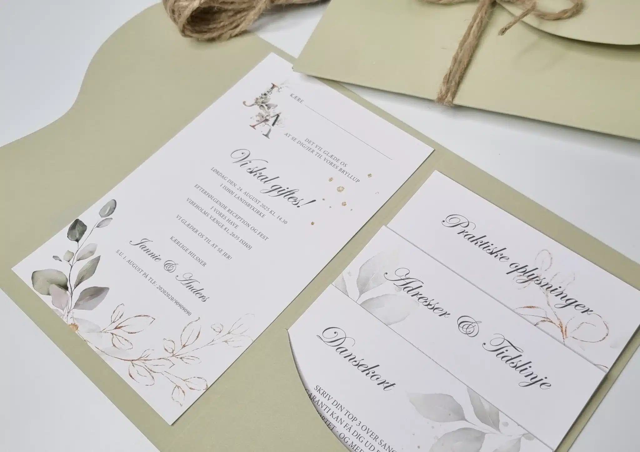 Vores mission er at gøre jeres dag både smuk og personlig, og vi kan tilpasse alle elementer efter jeres ønsker – lige fra papirvalg til små detaljer i layoutet. Kontakt os gerne, hvis I har specifikke ideer eller ønsker, så hjælper vi med at gøre dem til virkelighed!